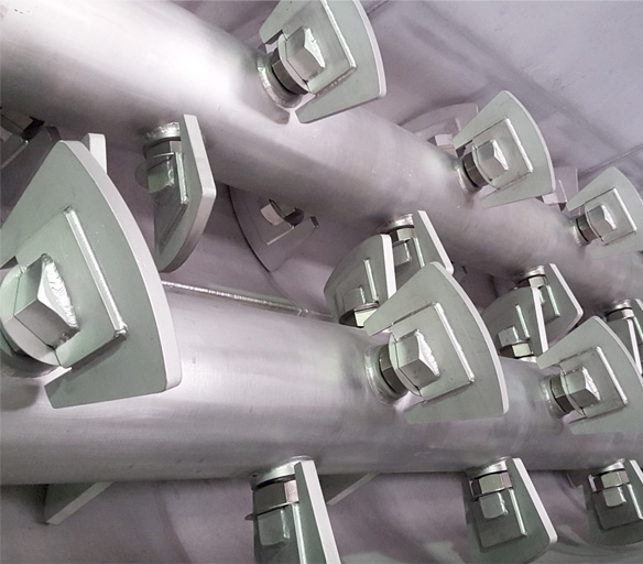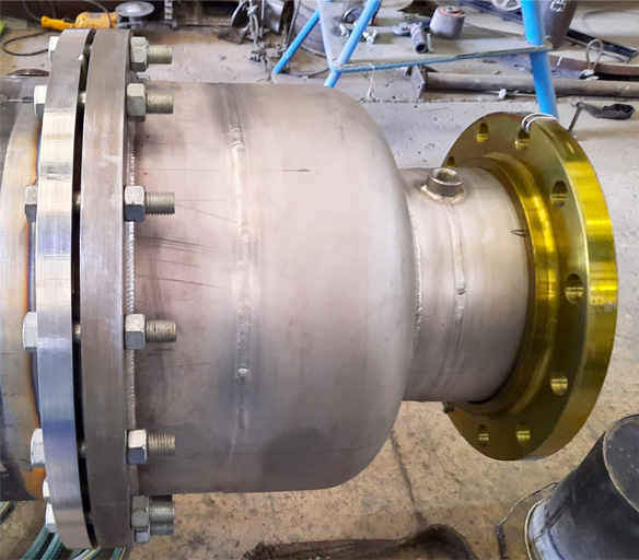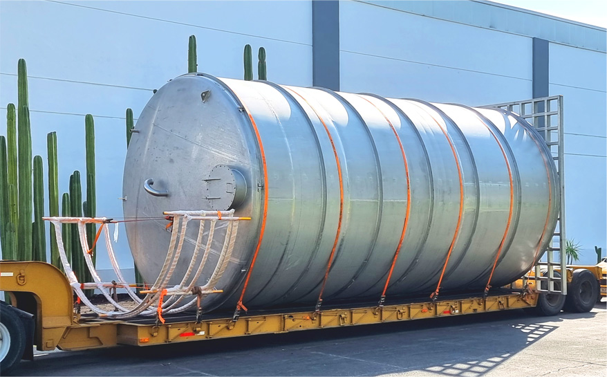Fabricación y traslado a planta de producción. Industria: Química alimenticia. Fabricación de intercambiador de calor de un paso con tapas semi elípticas con bridas en ambos extremos. Acero Inxosidable T-316.