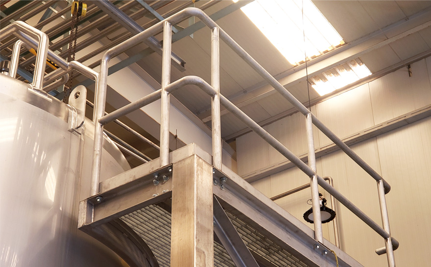 Fabricación, traslado e instalación en área. Industria: Tequilera. Fabricación de plataforma de inspección para tanques de acero inoxidable T-304 con rejilla antiderrapante y barandales de seguridad.